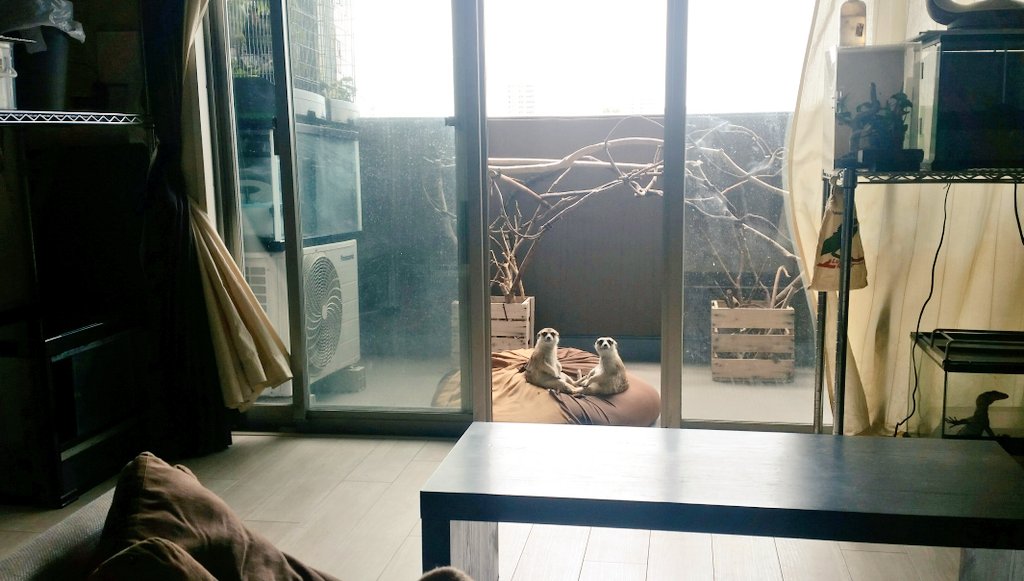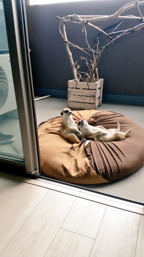 ▼Maya將狐獴在陽台曬太陽的照片po到推特上,說:「我往外一看,就看到這2隻坐在墊子上轉頭看我。」