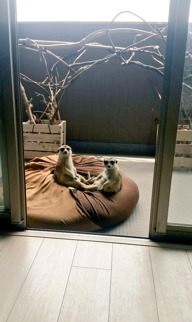 ▼2隻狐獴聽到「室友」開門回家的聲音,齊齊轉頭看過來。牠們一臉淡定,好像在說:「唷~你回來了啊。」