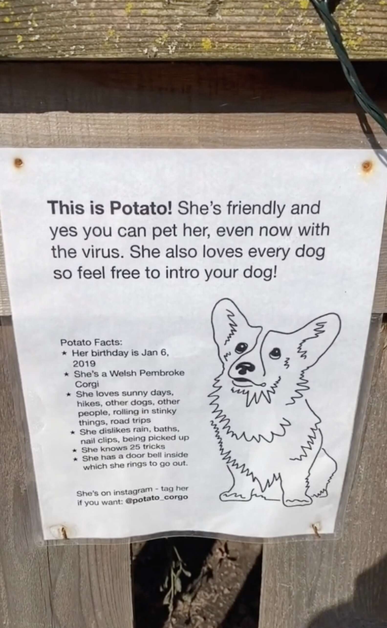 ▼Cee在門口貼了一張告示,告訴大家這段期間一樣可以跟Potato玩。她說:「我們想讓大家放心,可以盡情摸Potato。我們認為這是一個能夠幫助大家在特別時期減少孤獨感的好辦法。」