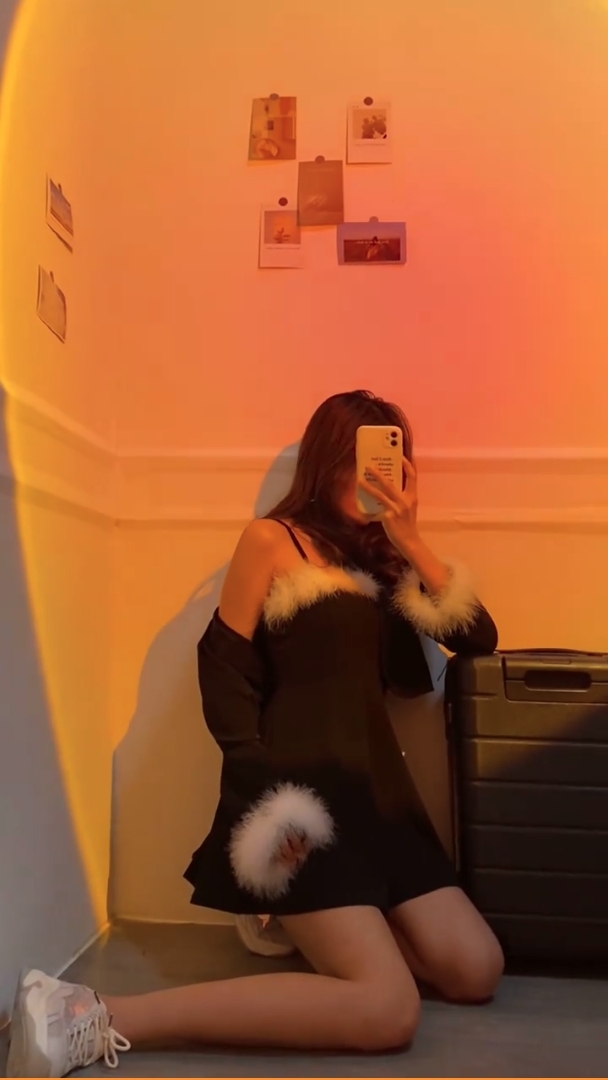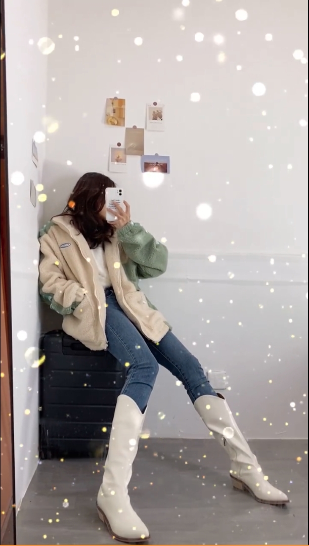 ▼跪在地上拍照的話,可以小心機地讓外套滑下露出香肩。