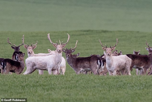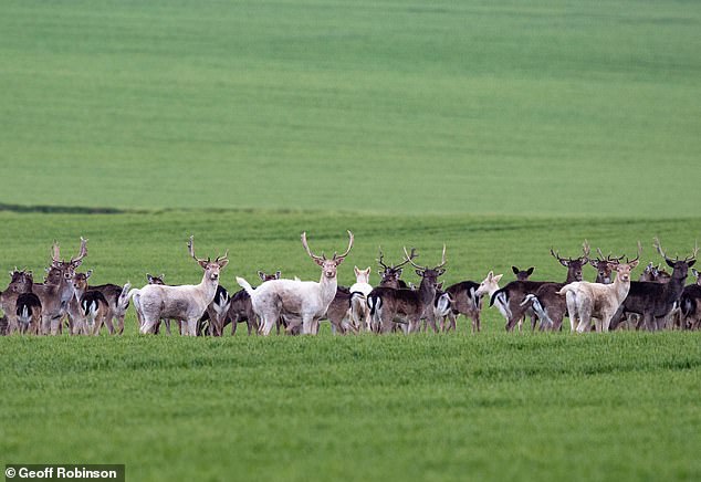 2021年03月22日神話故事中經常出現白色雄鹿的身影,牠們非常神秘,也非常罕見。日前有人在英格蘭哈特福郡(Hertfordshire)郊外看到一群野鹿,其中竟然有3隻白色雄鹿!據說牠們獨特的外表是白變(leucism)引起的,牠們的色素細胞與一般雄鹿不同,身體缺乏所有的色素類型,所以看起來是白色的~
