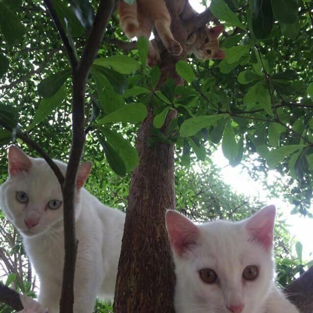 ▼這些貓咪花色不同,卻相處得很融洽。牠們分散在不同的樹枝上,見網友抬頭看,齊刷刷地望過來,反而把她嚇了一跳。