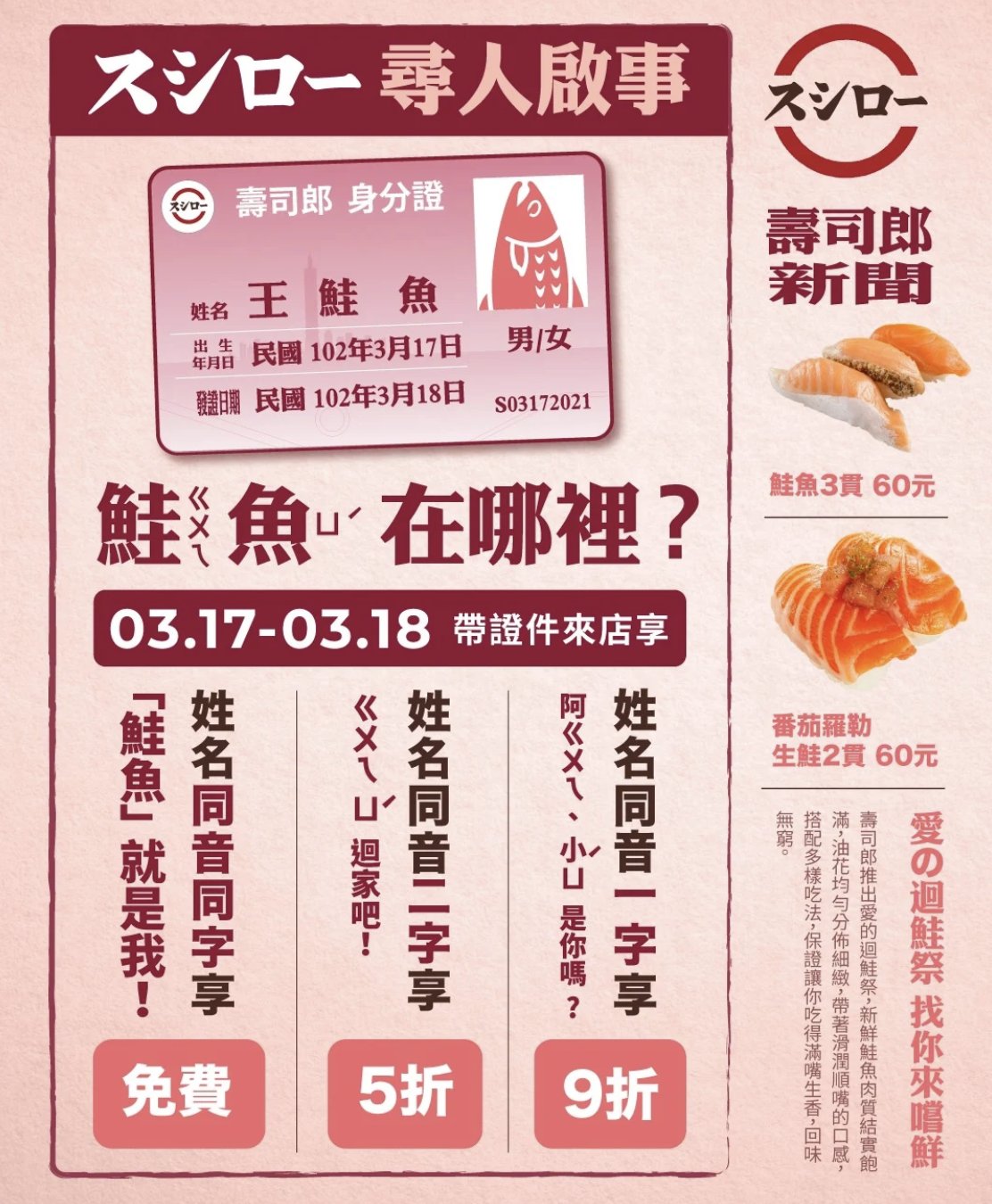 2021年03月21日知名連鎖迴轉壽司店「壽司郎」於本月17、18日推出「愛的迴鮭,尋人啟事」優惠活動,如果顧客的名字裡有「鮭魚」2字,就能免費吃壽司。這一活動引發一波改名潮。業者透露,活動期間服務1千多桌次,全台至少有300位民眾改名為「鮭魚」~