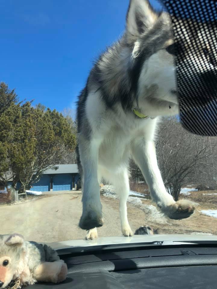 ▼看到主人坐在車上無動於衷,Nanook只好亮出自己的「大招」。一個箭步「跳上車」的Nanook決定親自盤問主人。