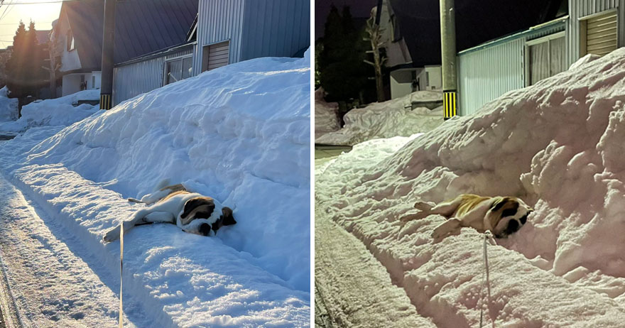 ▼推主表示,狗狗似乎喜歡上了那片雪地,早上、晚上外出散步時,都會在同一地點躺下休息。牠倒臥在雪地裡一動不動,這行為實在令人迷惑。一名老人散步時看到這一幕,還專門來詢問推主:「牠在這裡做什麼?」