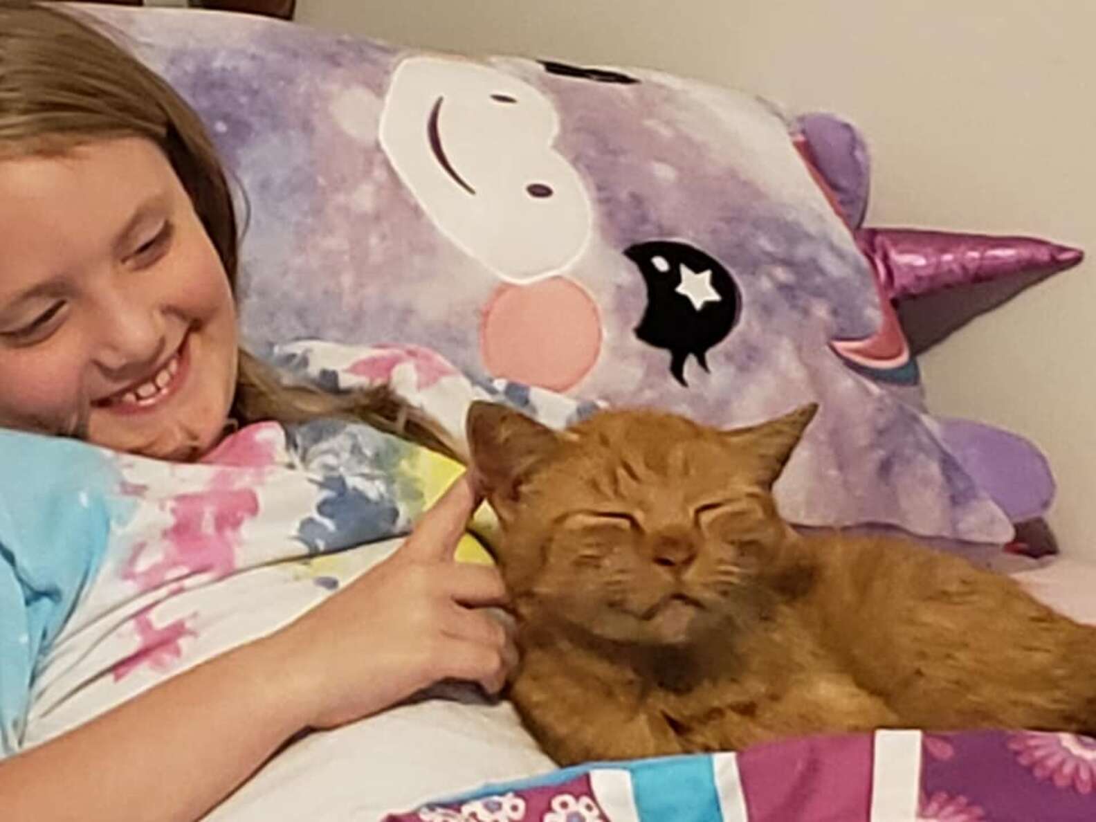 ▼Farrell給這隻貓咪取名為Pumpkin。隔天她帶貓咪去獸醫院驅蟲,然後詢問鄰居是否認識這隻貓咪。一番詢問後他們才知道,Pumpkin是一位鄰居家的寵物,不過牠平時是散養的。得到Pumpkin主人的允許後,這隻貓咪每天都會到Farrell家,找她的女兒一起玩,他們經常一起過夜。