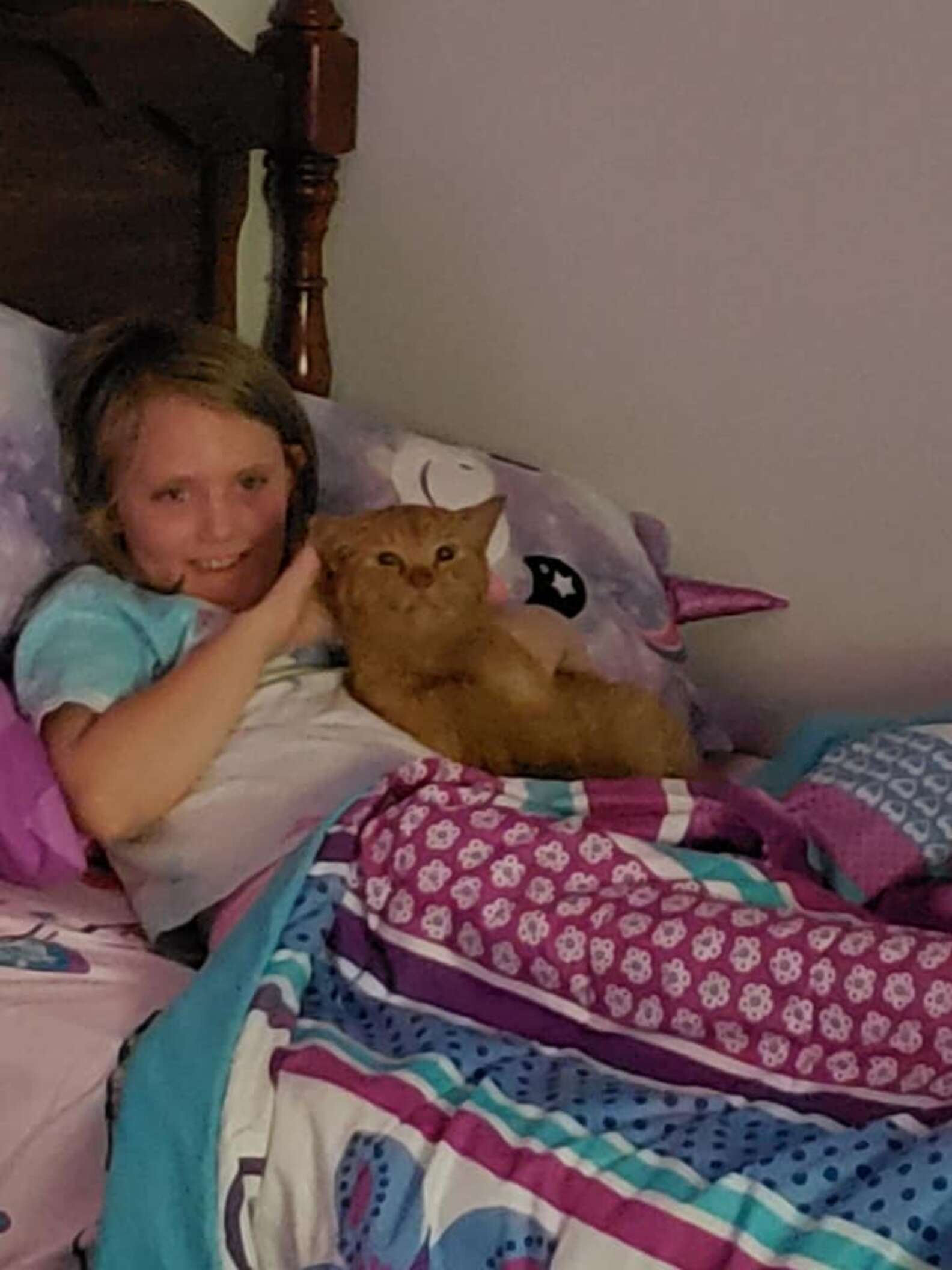 ▼女兒的床上有一隻陌生的橘貓。Farrell問過女兒才知道,貓咪已經在她的房間住了好幾天。她趁媽媽做飯的時候,悄悄把貓咪偷偷帶進來,還給貓咪準備了食物、水和貓砂盆。