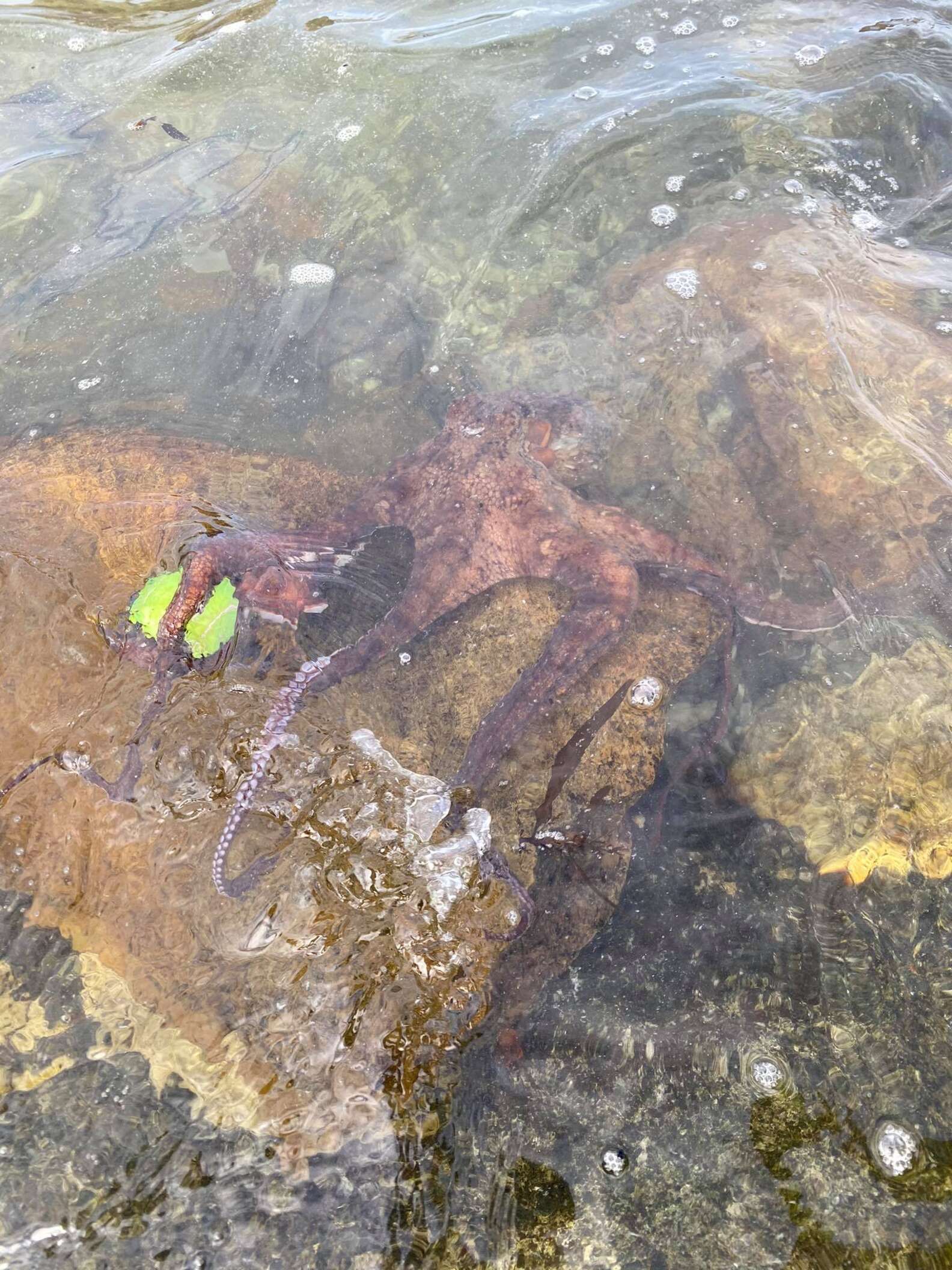 ▼一隻好奇心旺盛的章魚突然出現,搶走了Lucy的球。Riette說:「當時正在漲潮,那隻章魚突然從水裡浮現出來。」Lucy第一次看到章魚非常驚訝,嘴巴裡的網球都掉進水裡,牠還沒來得及將球撿回來,章魚就行動了起來。