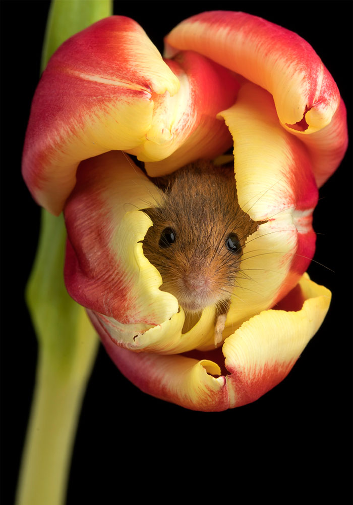 2021年03月28日對很多動物來說,花蜜是珍貴的美味。體型小巧的巢鼠(harvest mice)就很喜歡吃花蜜。英國攝影師Miles Herbert拍攝了一組巢鼠鑽進鬱金香花瓣中,採吃花蕊和花蜜的照片。那可愛的畫面超療癒,網友們的心都被融化了。