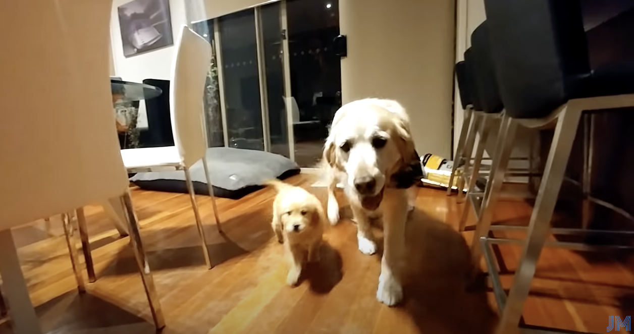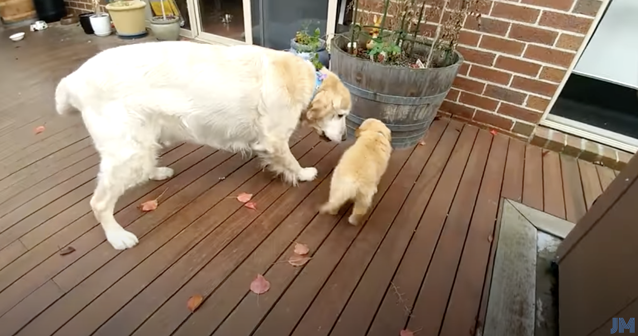 2021年03月31日黃金獵犬是汪汪界的大暖男,牠們聰明乖巧,是主人的好幫手。最近網友JoshMackow分享了一段影片,影片中是一隻大黃金和一隻小黃金初見的場景。大黃金看到弟弟非常興奮,不僅主動湊過去,還狂搖尾巴。體型小很多的小黃金反倒比較淡定,頗有人小鬼大的感覺。