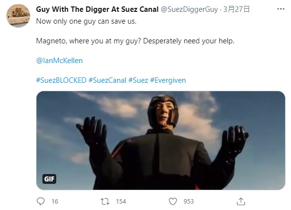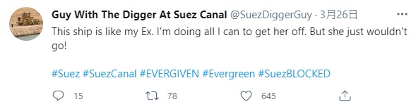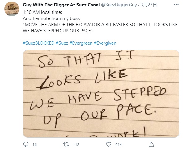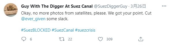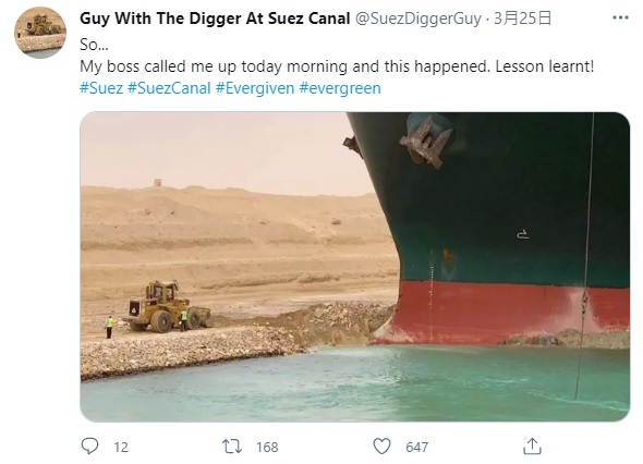 2021年03月31日長榮海運長賜號(Ever Given)終於脫困,蘇伊士運河也暢通了。這次擱淺事件中,所有參與救援的人都是不可或缺的功臣,尤其是那台在船頭默默開挖的小挖土機,更是引起全球網友的關注。小挖土機司機還在推特創立帳號「Guy With The Digger At Suez Canal」(在蘇伊士運河開挖土機的男人),分享救援的過程。他超幽默的吐槽笑翻網友~