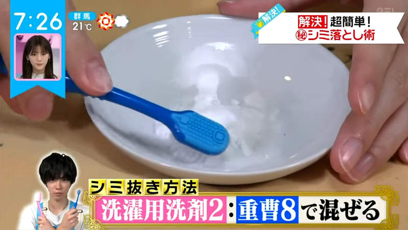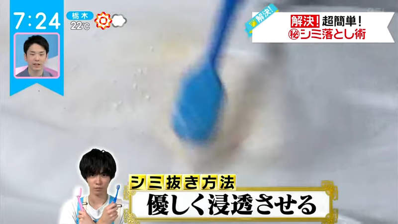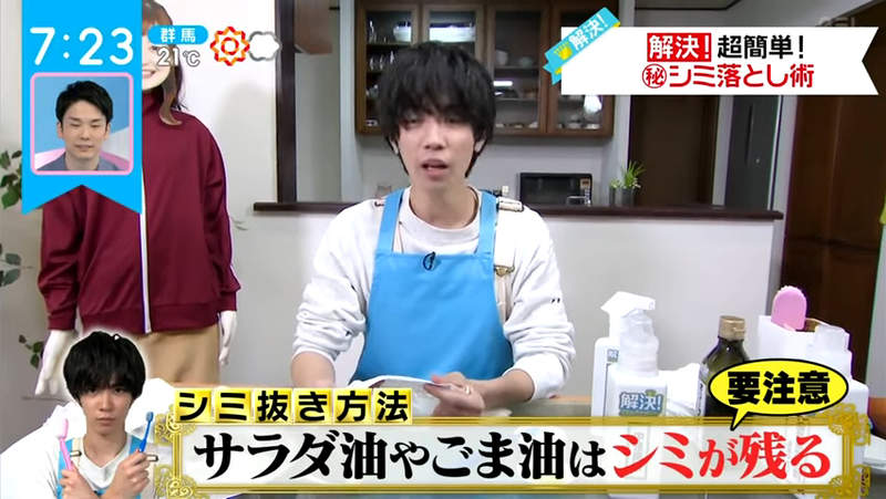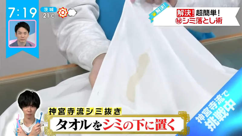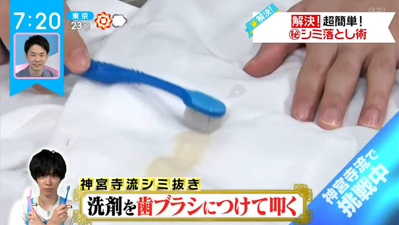 2021年04月04日衣服沾染洗不掉的污垢非常困擾!最近日本電視台的晨間情報節目《ZIP!》請來隸屬傑尼斯偶像團體「King & Prince」的神宮寺勇太,跟大家分享清潔方法。在去污專家的指導下,衣服上的頑固污漬只要用一根牙刷就能解決,就連讓無數人頭疼的醬油、咖哩污漬,都能輕鬆搞定。