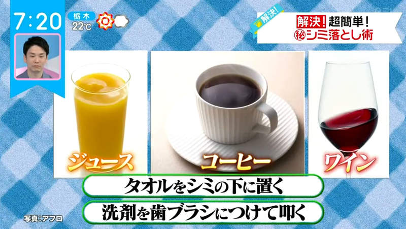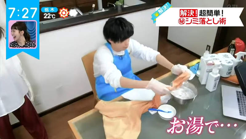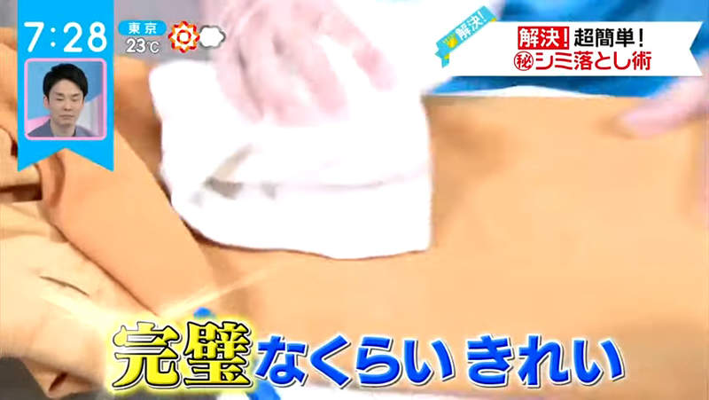 ▼不用專家出手,神宮寺勇太就輕輕鬆鬆解決飲料污漬。他先在污垢下方墊上毛巾;