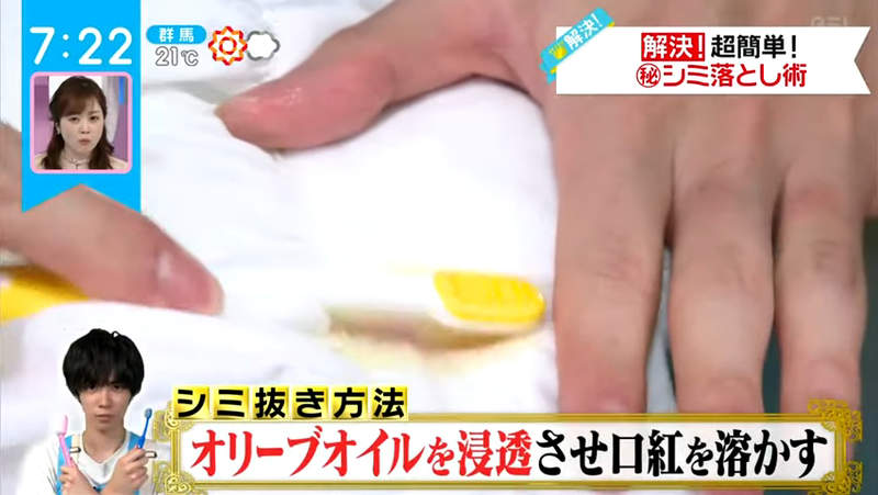 ▼飲料污漬屬於水性污垢,口紅則屬於油性污垢。神宮寺勇太先用牙刷沾取橄欖油,溶解衣服上的口紅;