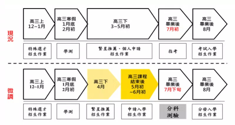 教育部表示,從111學年開始,適用大學多元入學方案。學測的時程不變,還是在每年寒假1至2月間進行,繁星推薦則後延到4月舉行,申請入學改在高三課程結束後的5、6月進行。指考的調整非常大,改名為「分科測驗」,而且在7月底舉行、8月分發,最晚在8月25日公告結果。