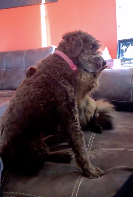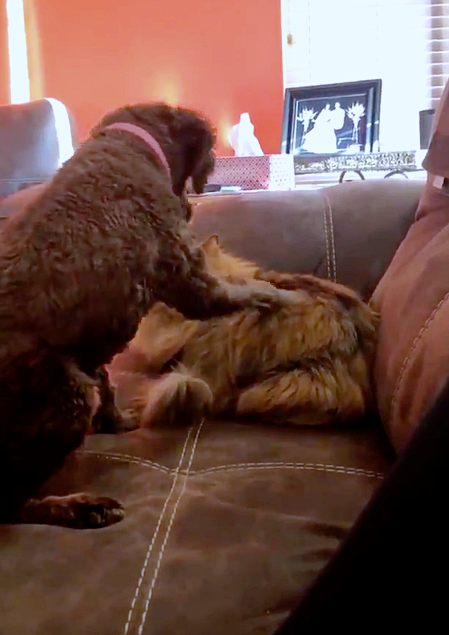 ▼Jordan家的貓咪Pumpkin和狗狗Maggie相處融洽,是非常好的朋友。不過牠們第一次見面時可不是這樣的。Pumpkin早就來到這個家,Maggie是後來的。Maggie剛剛被收編時,Pumpkin對牠充滿敵意,隨著時間的推移,牠們才慢慢變得親密起來。