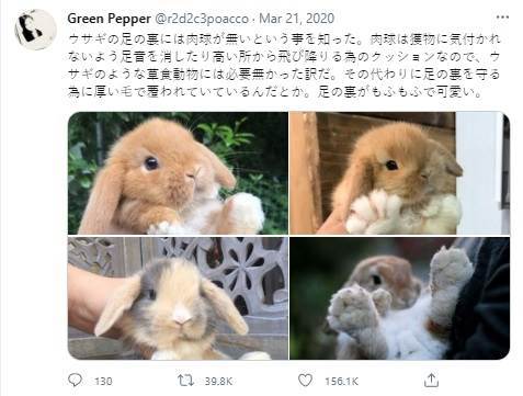 ▼日本網友Green Pepper在推特上分享了一張兔兔腳底的照片,兔兔的腳上竟然沒有肉球,全都是毛髮。Green Pepper在貼文中說:「我才知道兔子腳底沒有肉球。肉球是用來緩和腳步聲或從高處跳下來所需要的墊子,為了避免被獵物發現,但對於兔子等食草動物來說是沒有必要的。取而代之的是為了保護腳底,這才覆蓋著厚厚的毛。」