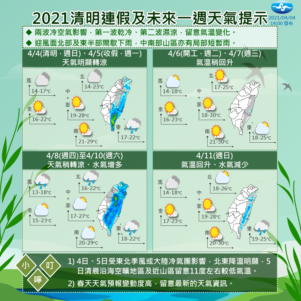 本週天氣多變,有兩波冷空氣一乾一濕先後影響。北台灣白天降溫明顯,大家一早出門多注意保暖。春季天氣變化太快,乍暖還寒,時有間歇雨,大家留意氣溫變化,外出記得攜帶雨具備用喔!