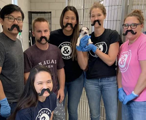▼很多人跟收容所聯絡,希望能領養這隻小狗。志工定製了一些「鬍子」,讓那些來看望小狗的人戴上,跟牠一起拍照。