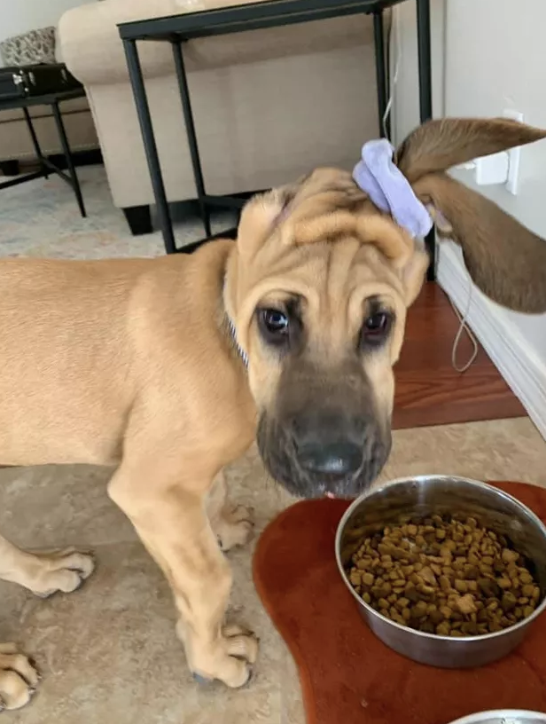 ▼耳朵太大了,吃飯的時候要綁起來才不會沾到。