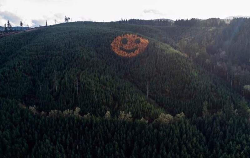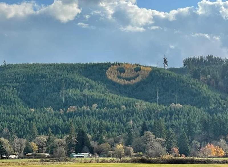 2021年04月13日美國俄勒岡州高速公路旁的山坡,是當地非常有名的打卡景點。每年秋天,山坡上都會出現一張可愛的黃色笑臉。一眼看去,黃色的圓型臉龐中有兩個綠色的「圓點眼睛」,還有代表著微笑的「嘴巴」。很多人專門開車從這裡經過,就是為了拍到這有趣的景象~