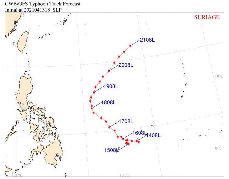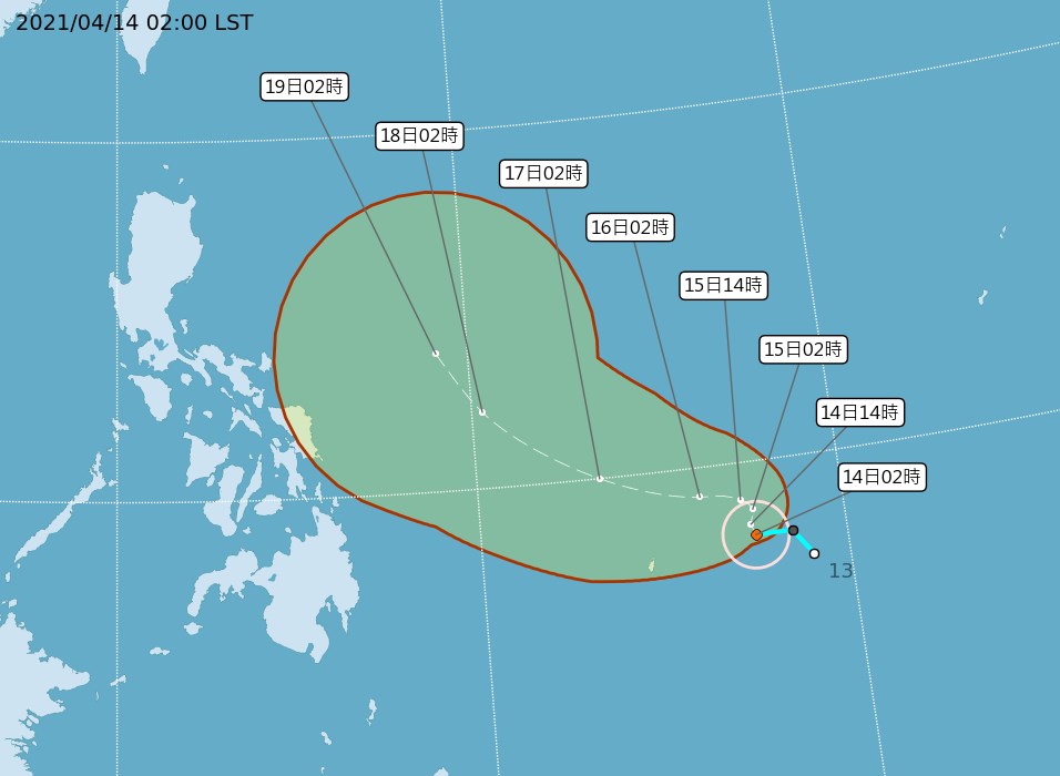 2021年04月14日中央氣象局表示,近日在菲律賓東南方形成的熱帶性低氣壓,已於今日(14日)凌晨2時增強為今年第2號颱風「舒力基」。未來路徑將逐漸往偏北朝東北方向進行,對台灣沒有直接影響。今天東北季風持續增強,這一波東北季風伴隨的水氣較多,北部降雨會較為明顯。