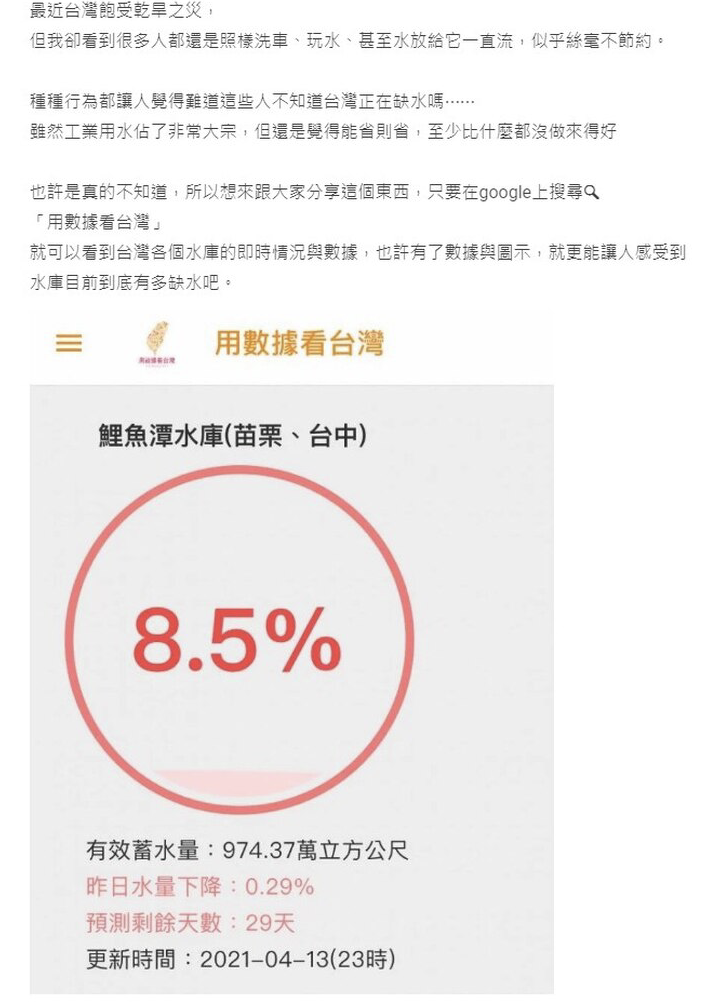 2021年04月20日台灣近期面臨缺水危機,中南部縣市紛紛實行限水措施。一名女大生在Dcard發文表示,現在很多人還是「照樣洗車、玩水、甚至水放給它一直流」。她忍不住呼籲:「有多少人不知道台灣正在缺水?」沒想到這則貼文竟引發一場論戰。