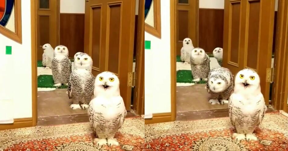 ▼這天雪鴞們揪團去客廳玩耍,但是第一隻雪鴞突然在門口停下不動了,跟在後面的雪鴞們雖然一臉疑惑地四處張望,但是不爭不搶,還很守規矩地排好了隊伍。