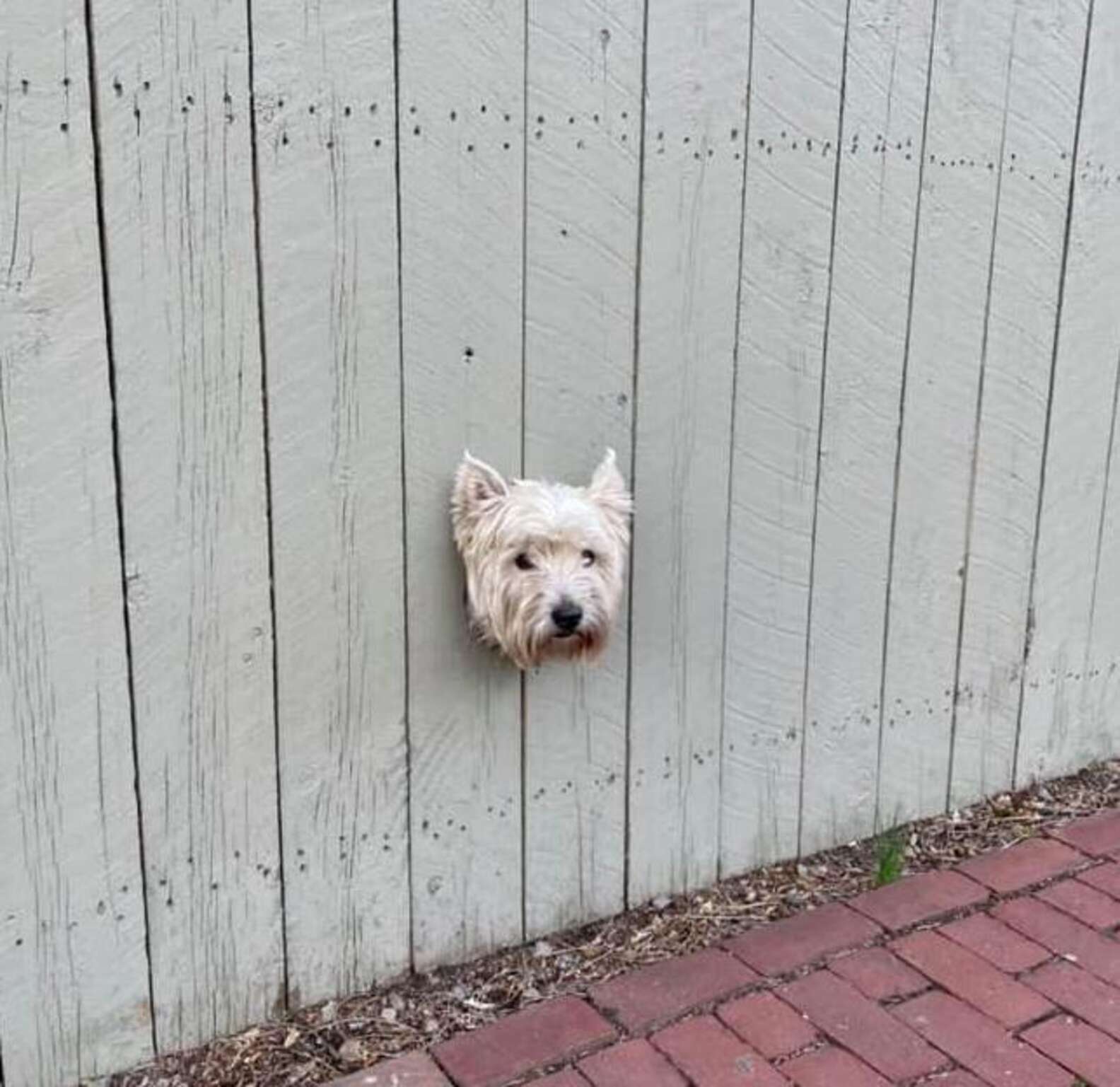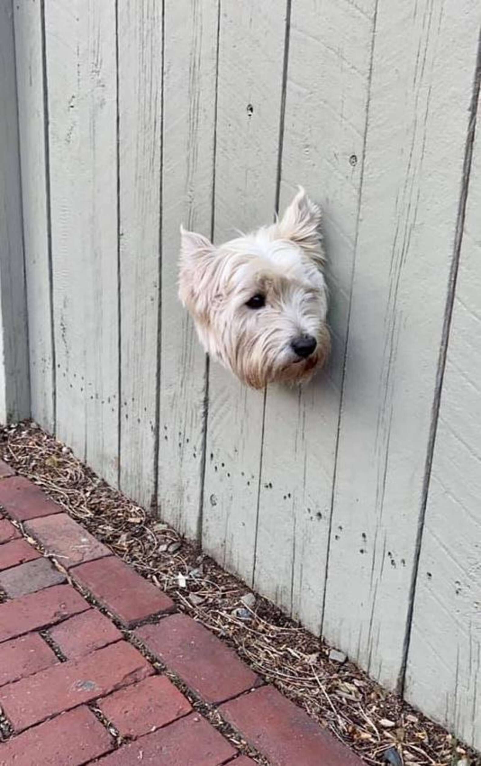 ▼提起跟這隻狗狗的緣分,Hutter覺得很有趣。那天她經過這條街,突然聽到一個奇怪的聲音,轉頭就看到一顆西高地白㹴的頭「漂浮」在空中。另一個慢跑的人看到後忍不住驚呼出聲。這隻狗狗在窺探街景,牠沒有發出聲音吸引路人的注意,也沒有熱切討摸摸,只是從柵欄的洞裡探出頭,看來來往往的行人而已。