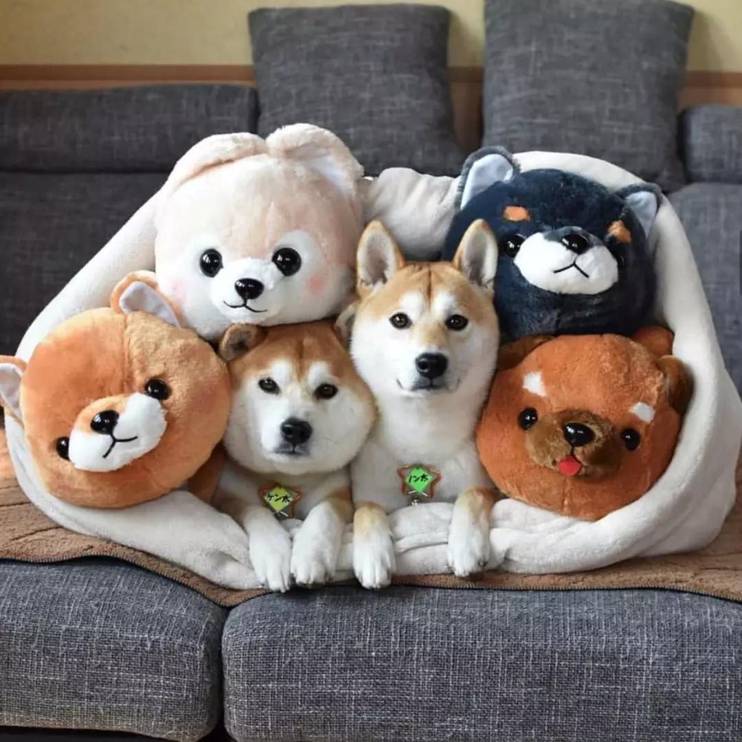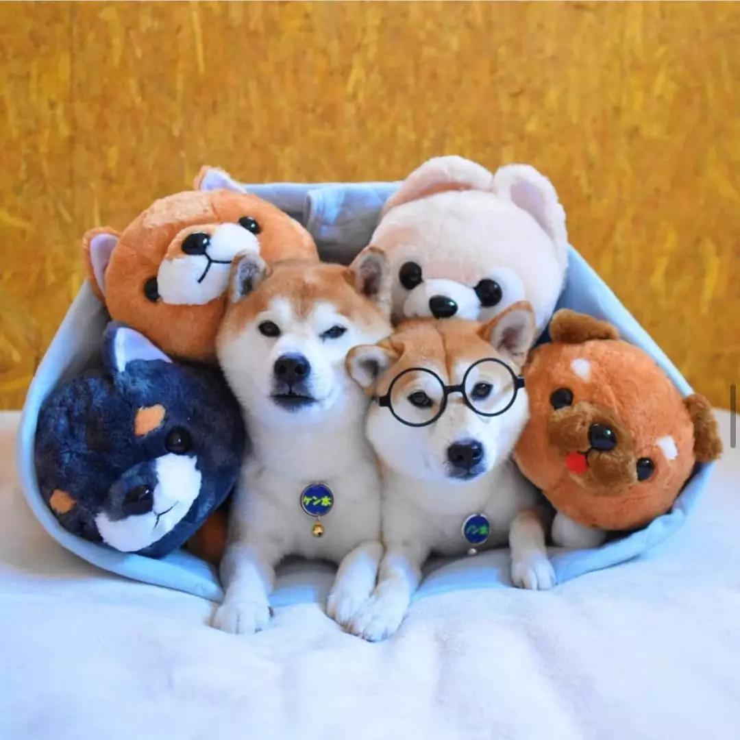 ▼主人很寵愛這兩隻柴柴,給牠們買了很多玩偶。柴柴們跟玩偶一起拍照,畫風萌得不可思議。