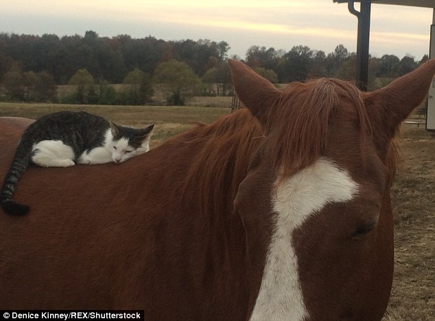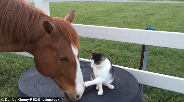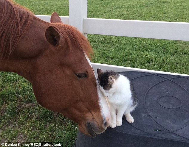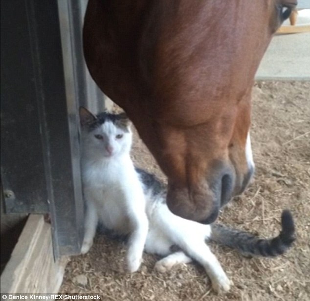 2021年04月23日友誼能夠跨越物種的限制!Denice Kinney是美國伊利諾州的一位農場主。他養了一隻叫Dakota的棕馬,還收養了一隻叫Sappy的貓咪。Sappy還是一隻幼崽時就來到了農場,Dakota對這隻小貓非常好奇,這兩隻體型差異巨大的動物很快就成為了好朋友。