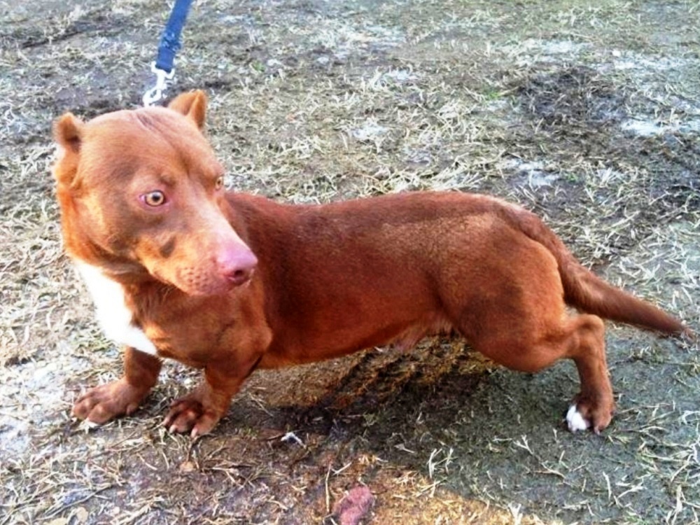 ▼Rami原本是一隻流浪狗。有一天動物保護協會接獲通報,一名男子打電話說,一隻長相奇特的浪浪跑到自己家。工作人員趕到現場時驚呆了,他們從來沒有見過這樣的狗狗。Rami剛剛1歲,作為一隻比特犬和臘腸狗的混種犬,牠的外表很有特色。