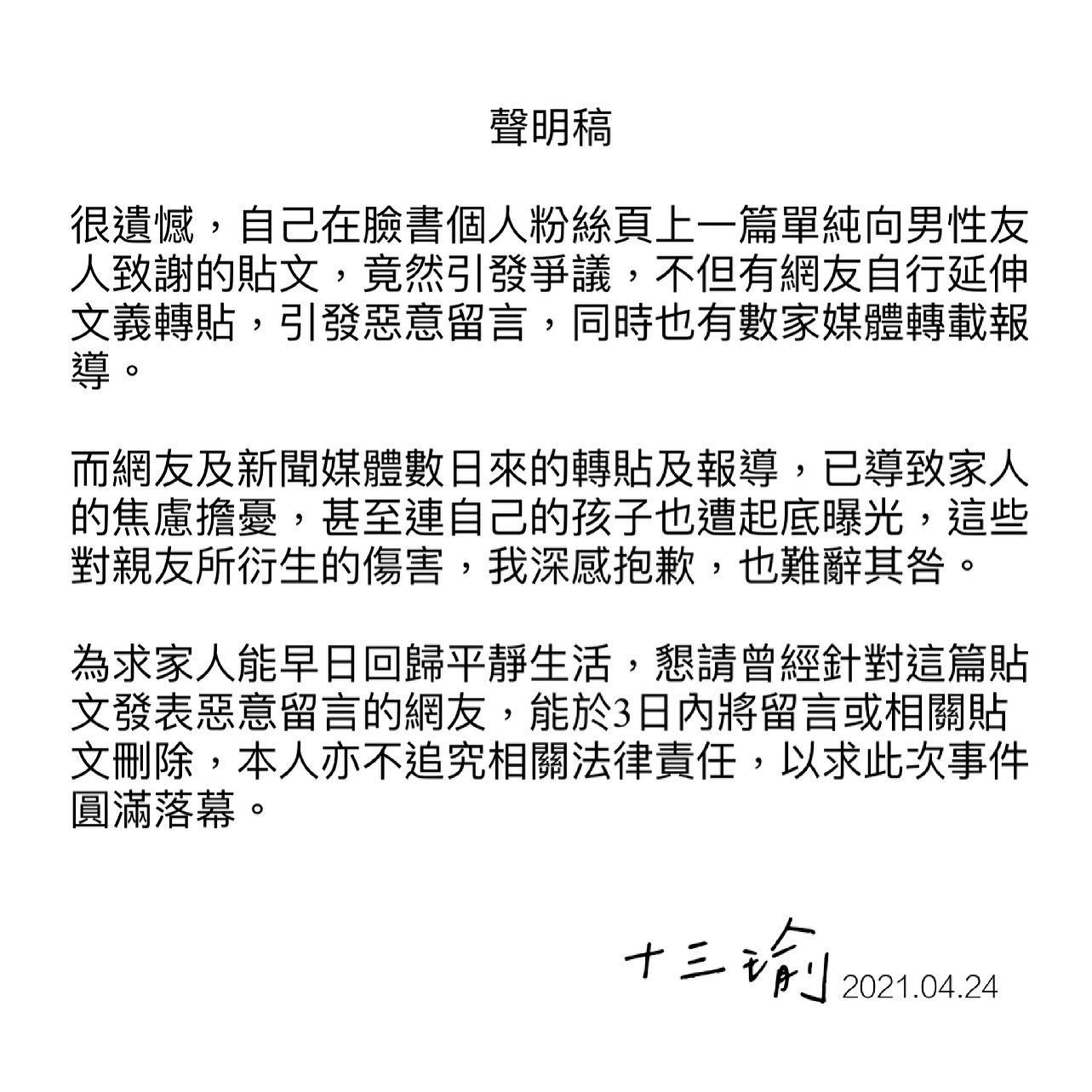 ▼「十三瑜」沉默6天,於24日發表聲明回應,網友和新聞媒體連日來的轉貼、報導,導致家人焦慮擔憂,連自己的孩子也遭起底曝光。她懇請曾對這篇貼文發表惡意留言的網友,3日內將留言或相關貼文刪除,她就不追究相關法律責任。