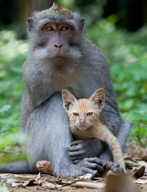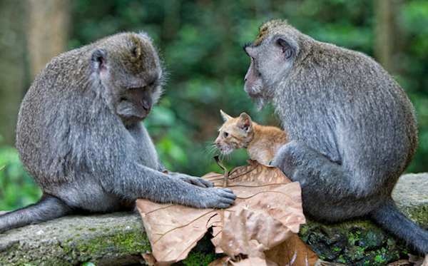 ▼這不是第一隻收養其他物種幼崽的母猴,印尼峇厘島的烏布猴子森林公園中,就有一隻母猴收養了一隻小貓。野生動物攝影師Anne Young偶然拍到了母猴和小貓相處的畫面,那隻母猴將小貓當成親生的小孩,還把牠帶到了猴群裡,猴群已經默認牠是其中的一員了。