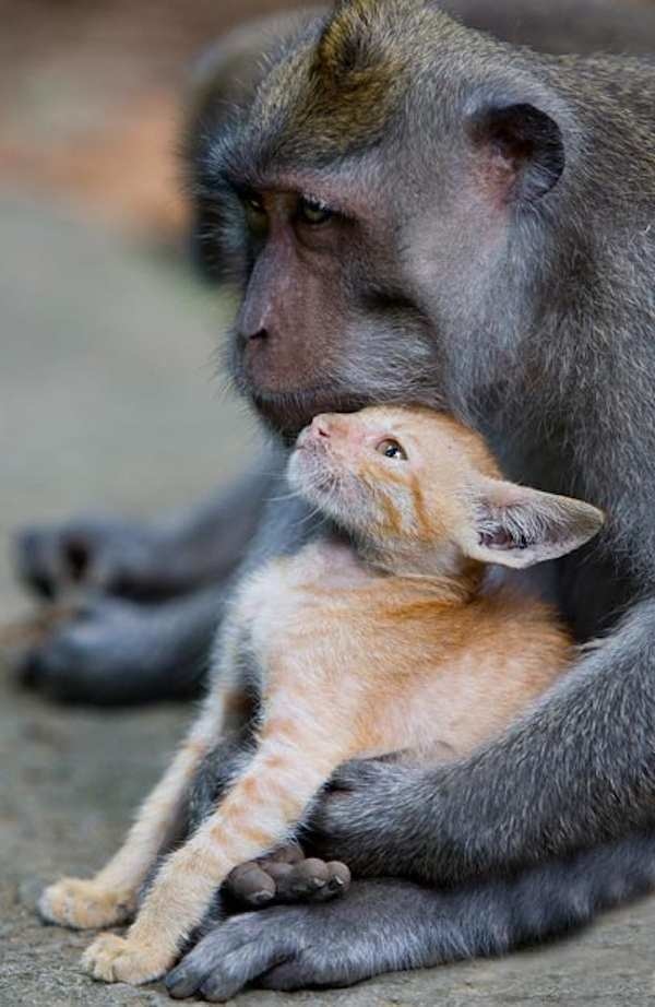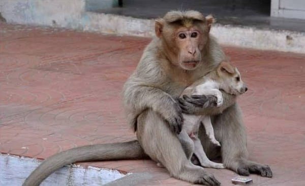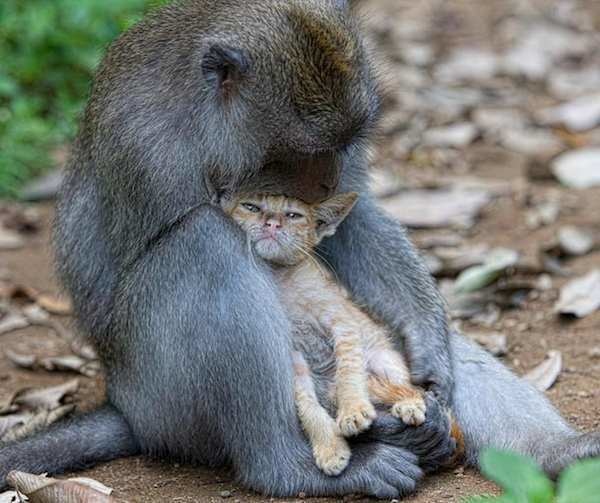 萬物皆有靈,猴子將小狗、小貓當成自己的孩子來照顧,跨越物種的親情在自然界中時有發生啊~