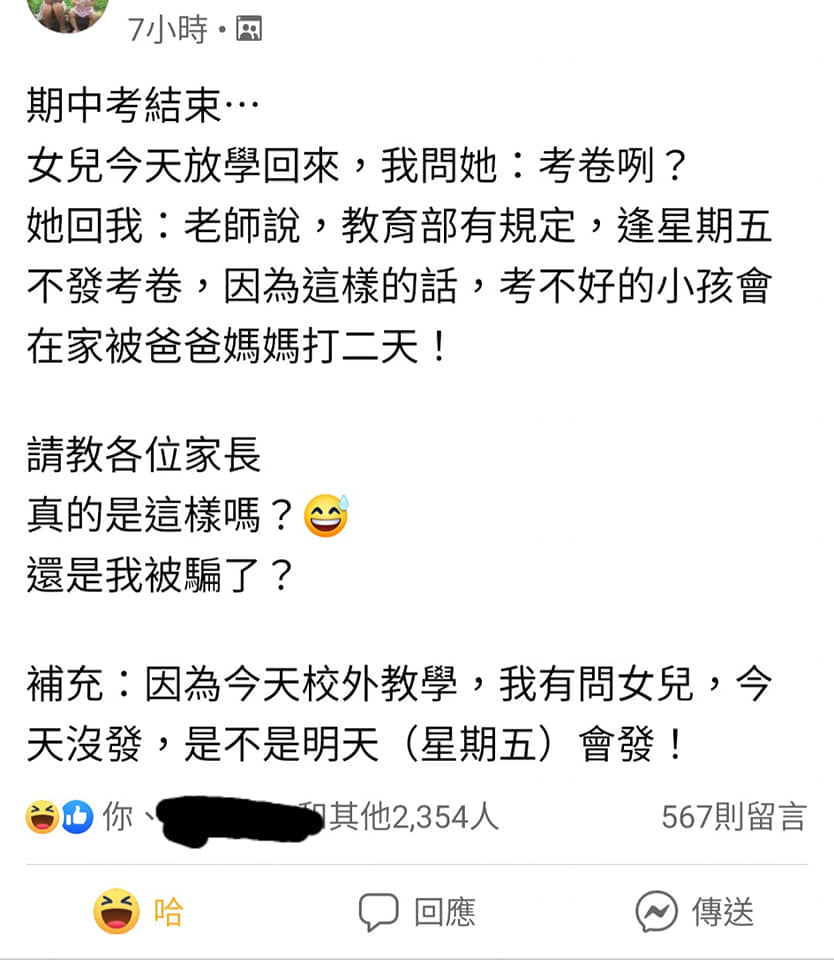 ▼翟本喬在臉書貼出那位家長的臉書截圖,內容提到他要求女兒交出期中考考卷,沒想到女兒聽到後理直氣壯回答:「老師說,教育部有規定,逢星期五不發考卷,因為這樣的話,考不好的小孩會在家被爸爸媽媽打二天!」家長聽到後非常困惑,上網詢問網友:「真的是這樣嗎?還是我被騙了?」
