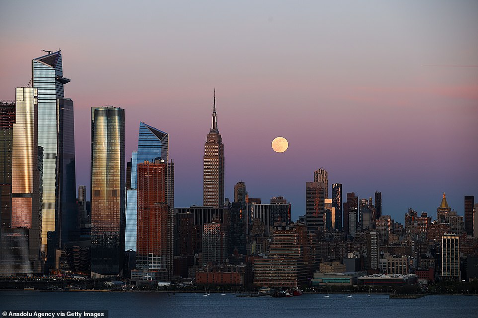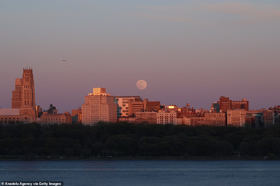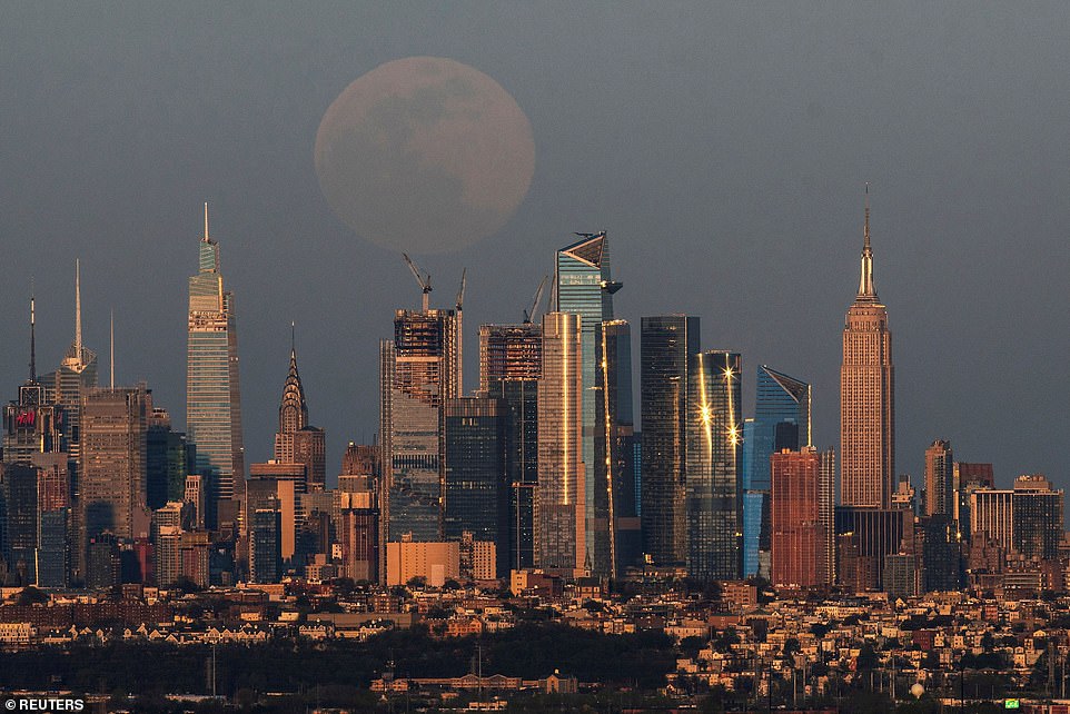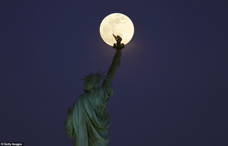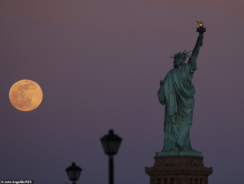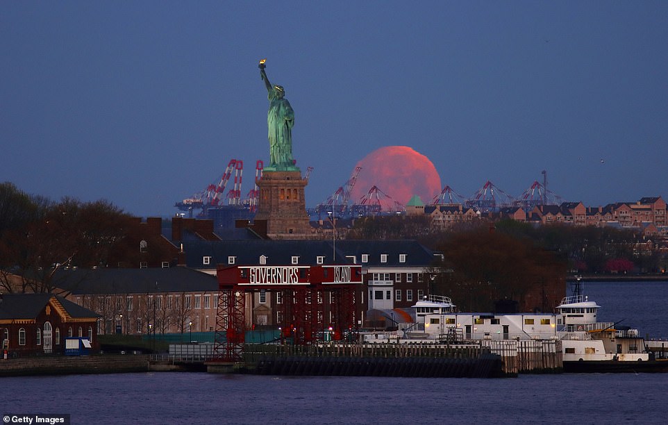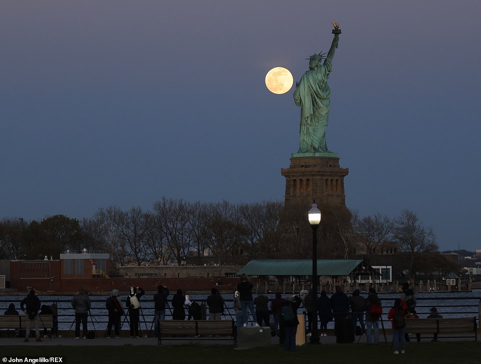 絕美!「超級粉紅月亮」點亮紐約夜空 與自由女神像交相輝映