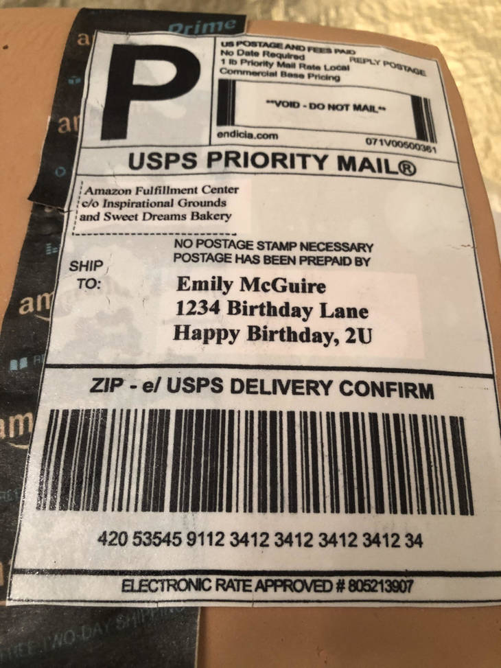 ▼Mac特別訂製了一個生日蛋糕,蛋糕是Amazon包裹的模樣,連運單都沒有落下,上面有發件人、收件人的訊息。這個「包裹」是從北卡羅來納州的鄧恩(Dunn)寄來的。