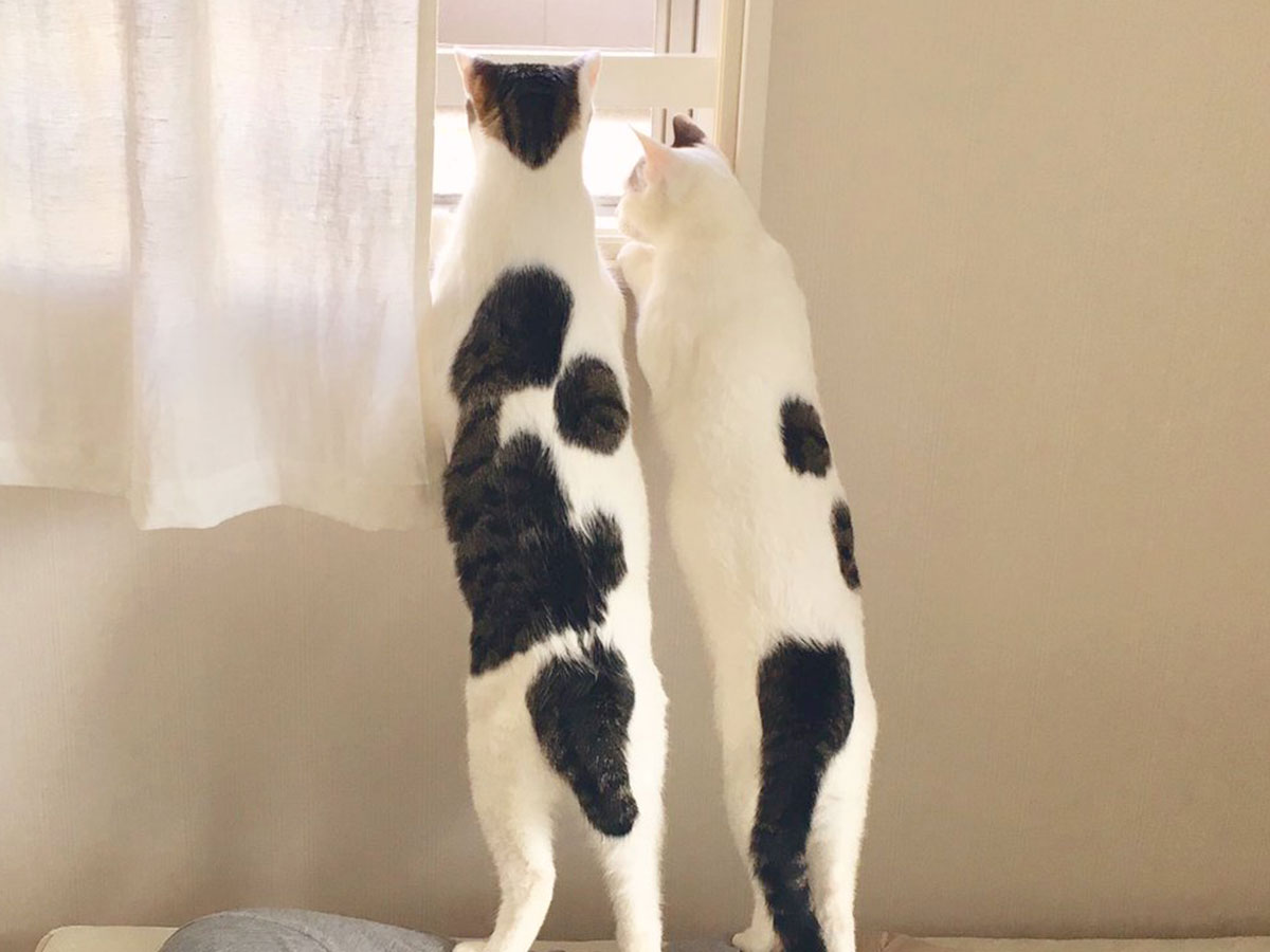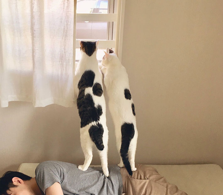 ▼這位網友Kensei Ogata養了2隻可愛的貓咪Lou和Nico。有一天貓咪們似乎發現窗外有動靜,好奇地攀在窗台往外看。牠們用後腿站立,前腿攀著窗台,看似很正常,但看看牠們的腳下,就明白真相了。