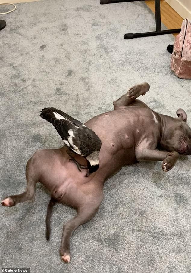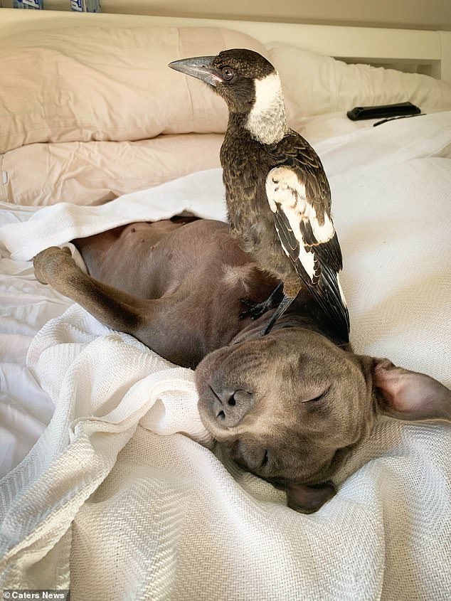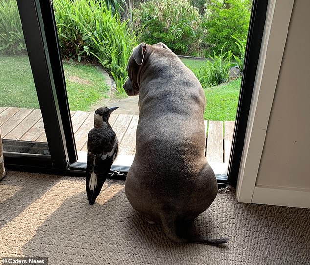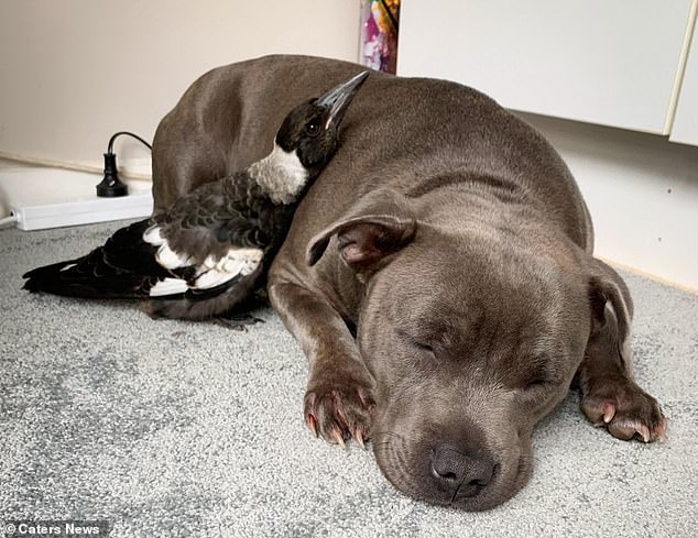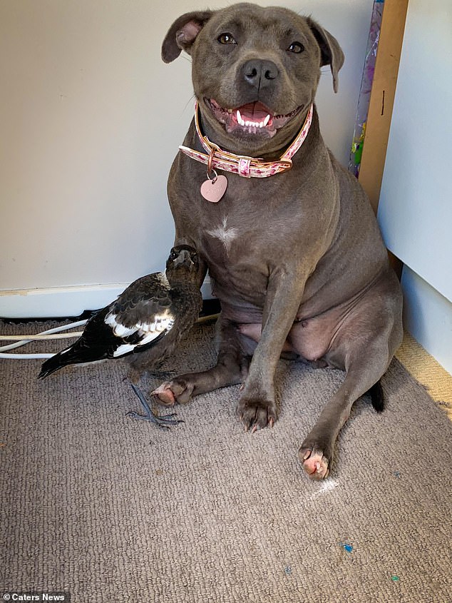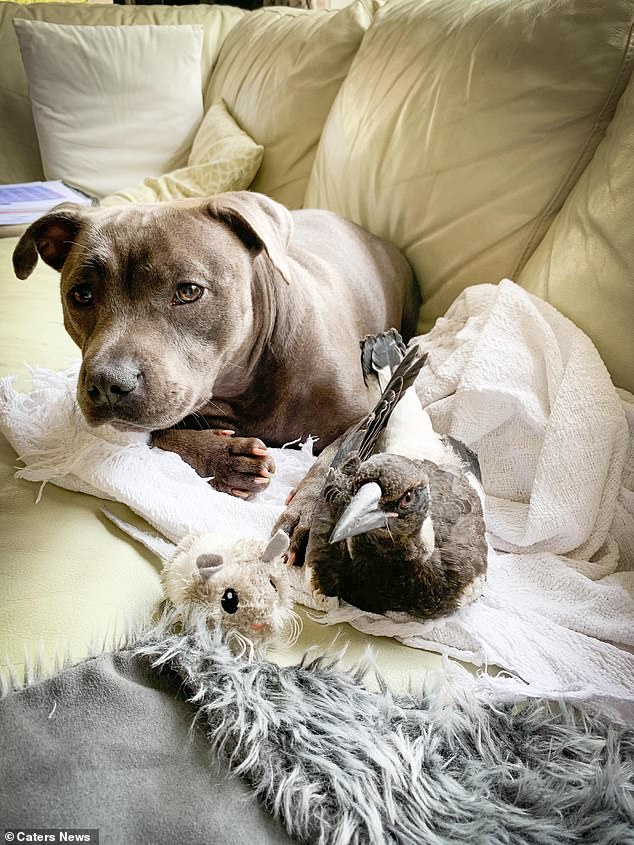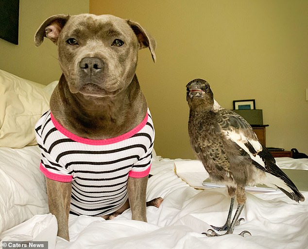 2021年05月12日澳洲昆士蘭州45歲女子Juliette Wells養了一隻狗狗Peggy。有一天Juliette外出遛狗時發現了一隻受傷的喜鵲,於是她將喜鵲帶回家照顧。Peggy以前沒有近距離接觸過鳥類,剛開始有點害怕,但牠很快就接受了這個新室友,還把牠當成自己的小孩來照顧。
