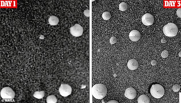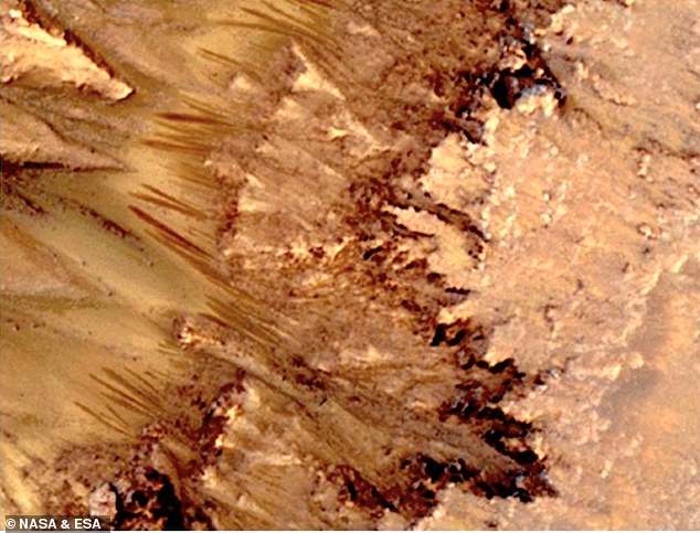 ▼Joseph和研究人員稱,春天白天的溫度達到42℉時,這些「蜘蛛狀」物體能生長到980英尺;冬天氣溫下降到零下9℉時,這些形狀就消失了。不過NASA曾表示,這些「蜘蛛狀」物體是季節性二氧化碳冰融化的結果。但Joseph在研究中說,冰凍的二氧化碳不是黑色的,而是半透明的白色,他們認為這是由大量的真菌和其他生物組成的。