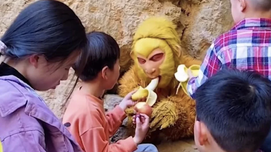 工作人員扮「孫悟空」壓五指山下 遊客狂餵香蕉崩潰:真的吃不下了!