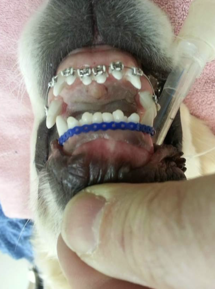 ▼狗狗矯正牙齒的時間比人類短很多,只要過幾週,Wesley就能拆掉了。