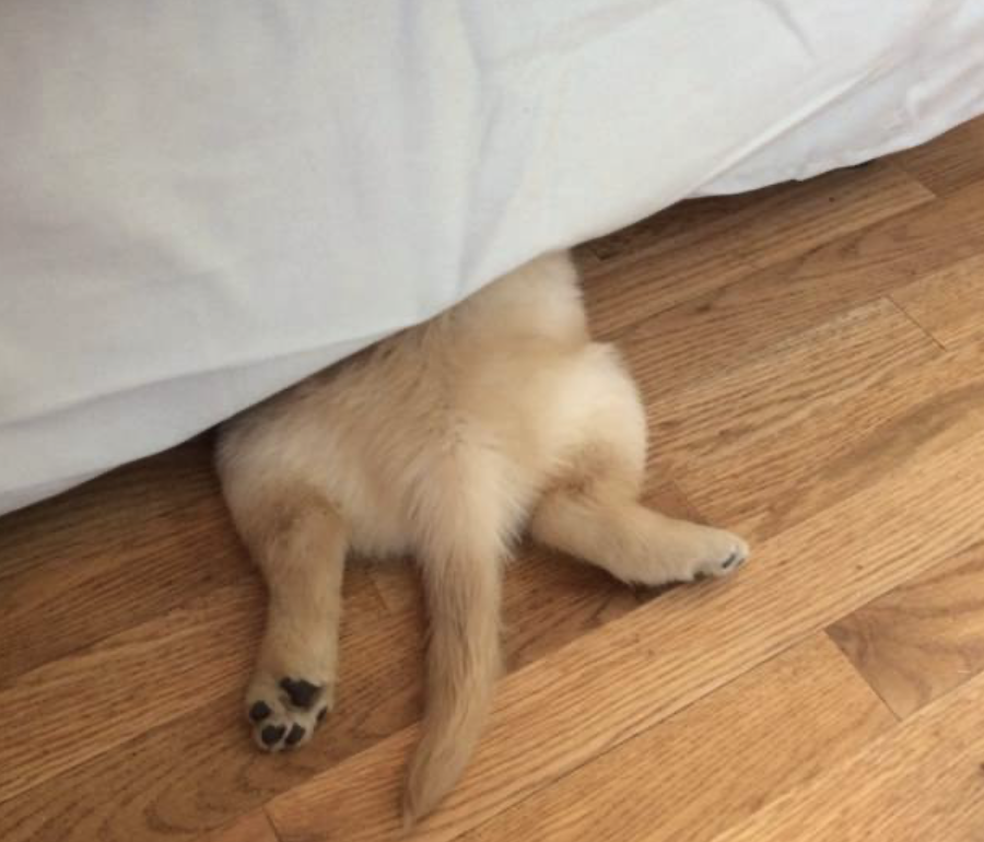 ▼鋼牙Wesley有點害羞,鑽進床底下只露出尾巴和小屁屁。
