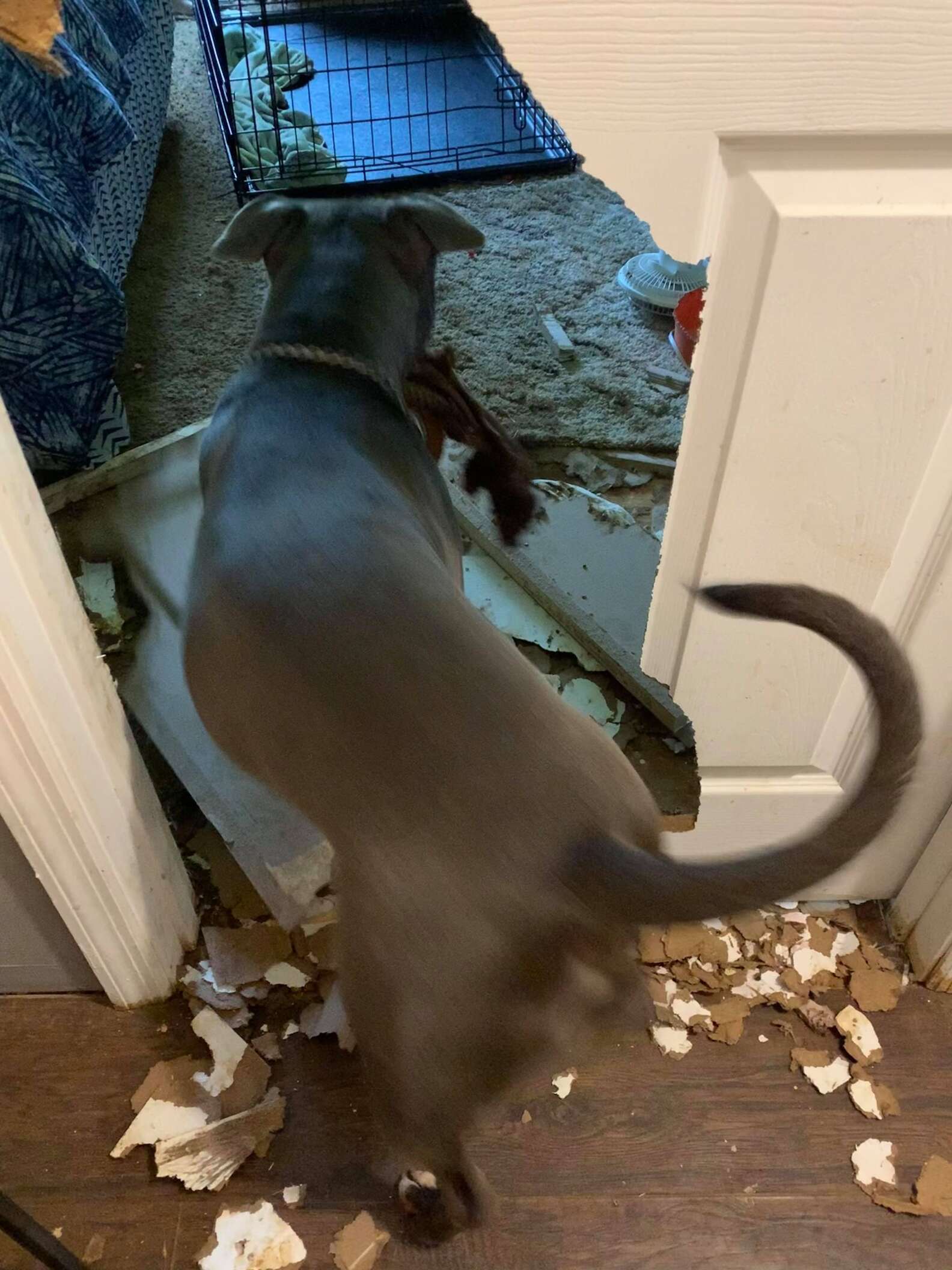 ▼Vickie本想將Bo關到籠子裡,以免牠再拆家,但Bo直接將籠子咬爛,還拆了門。Vickie回家看到這一幕非常擔心,連忙帶狗狗去看獸醫,確定Bo的牙齒、嘴巴、爪子都沒事,才鬆了一口氣。