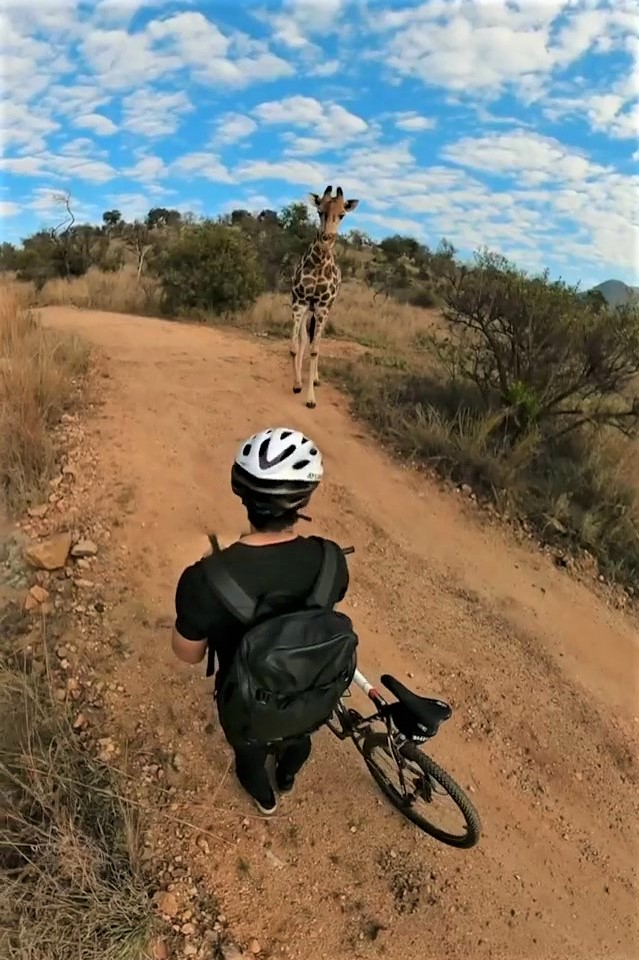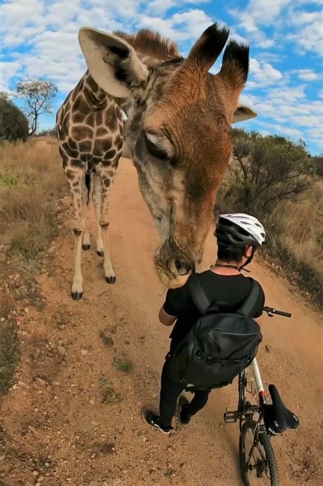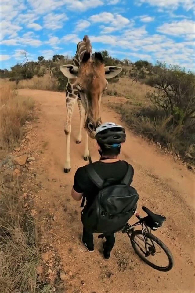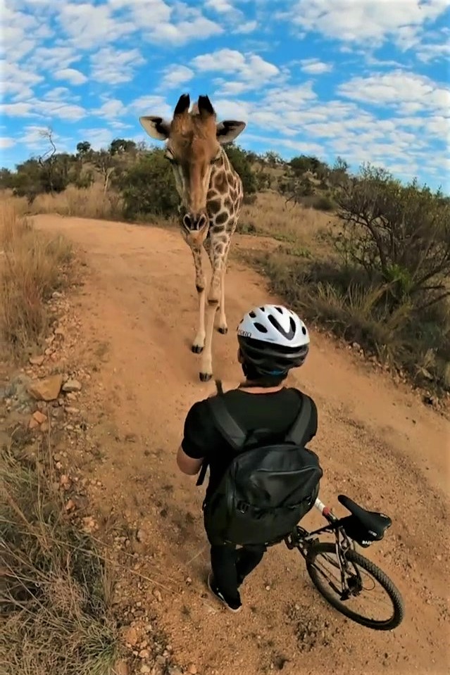 2021年05月13日這裡有一位超負責任的高個子警衛~日前南非約翰尼斯堡的年輕攝影師Timmy Moser和女友Tazz Scriven一起前往野生動物保護區Lion and Safari Park旅行。兩人沿著建議路線騎乘越野腳踏車遊覽,順便拍攝照片,沒想到半路上竟然被一隻長頸鹿欄下盤查。
