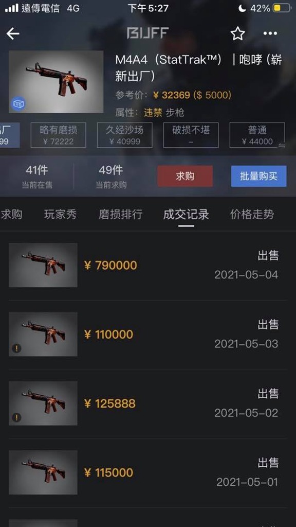 ▼這把槍的貼紙皮膚是絕版的超稀有存在,而且磨損程度極低,最終以79萬人民幣的價格成交,創下該槍枝造型售價的新紀錄。這一筆槍枝造型成功售出,也迅速引發全球玩家熱烈討論。