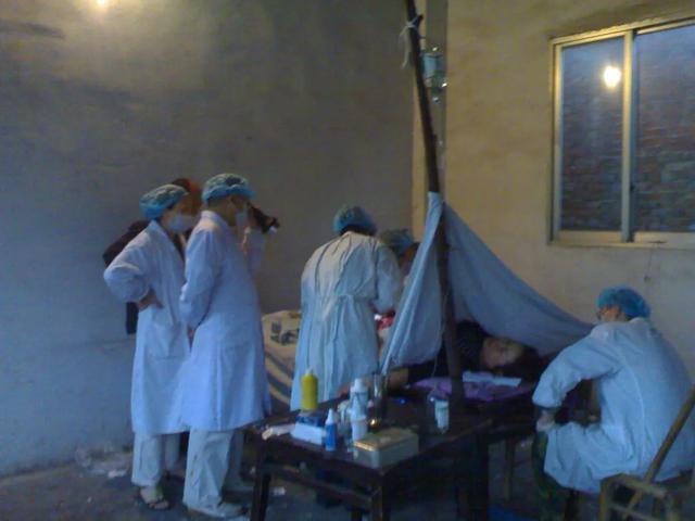 ▼孕婦沒有產床,就把寺廟的板凳拼起來當成產床;孕婦生下小孩後要輸液,但沒有輸液架,就用掃帚、樹枝來代替;地震後停電,大家就找來手電筒,為醫生們照明。