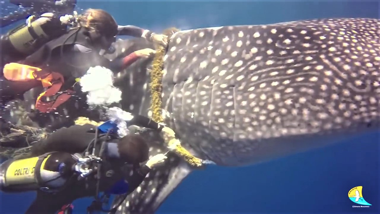 我不太舒服...潛水遇鯨鯊「主動靠近求援」 幫割斷繩索竟開心繞一圈:來擊掌~