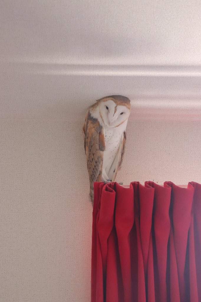 ▼ギズモ竟然躲在窗簾上方,整隻貓頭鷹變得扁扁的,全身的每一根羽毛都在訴說著抗拒: